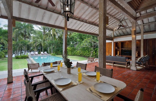 Villa Dua is one of three villas at The Melaya Villas compound. It consists of three 3-bedroom holiday villas right on the beach of North West Bali. The villas are luxuriously equipped with a large pool of 5 meters x 15 meters and a lush tropical garden of 2000 meters squares directly adjacent to the beach. The living area of the villa is an antique Joglo that has been moved from Java to Bali. Most of Joglo part are at least 70 years old and therefore it gives the villa a truly authentic Indonesian character. The bedrooms are situated around the Joglo, each with a private rain shower bathroom, air-conditioned bedroom, a fan, a mosquito net, a walk in closet, safety box, and study table.