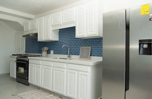 The fully equipped kitchen is complete with an oven, stove, microwave, refrigerator, and all the cookware needed to prepare meals. The blue-tile backsplash adds a modern touch, and the dining table is ideal for shared meals or working remotely.