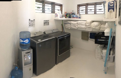 Water: The villa is 100% off grid, so that means all the water comes from a rainwater catchment system supplemented by bringing in water by truck. The water is stored in a 35,000 liter cistern underneath the house and two water chlorination tanks of 1,100 liters each. The system is designed to last about 30 days with no refills. To protect the plumbing and make your showers more relaxing we have a whole-house water softener installed. To avoid interruptions please conserve the water. The kitchen also has a water cooler with 20 liter water bottles for drinking.