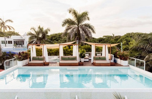 Open-plan living, eight gorgeous suites, and killer ocean views from the rooftop infinity pool make this dashing private villa in Playacar a top-flight refuge steps away from the sand.