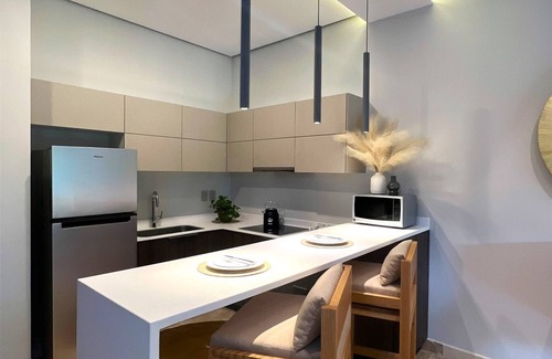 Welcome to your luxurious retreat! This stunning 2-bedroom, 2-bathroom flat boasts a spacious layout, featuring a master suite with an en-suite bathroom and a king-size bed for comfort. The second bedroom also offers a king-size bed, ensuring a restful night's sleep for all guests. Prepare culinary delights in the expansive, fully equipped kitchen, complete with top-of-the-line appliances and ample counter space for meal prep. The custom laundry room includes a convenient washer/dryer combo, making laundry chores a breeze. Relax and unwind in the generously sized living room adorned with modern decorations and enjoy entertainment on the impressive 56-inch TV. Step outside to your own private oasis, where a large pool awaits surrounded by sun loungers, perfect for soaking up the sun and enjoying leisurely dips to beat the heat. Whether you're seeking relaxation or adventure, this villa offers the perfect blend of comfort and luxury for your getaway.