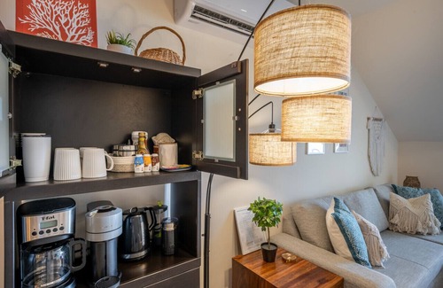 The Seaside Penthouse is a gorgeous condo in an unspoiled beach town that also happens to be a turtle sanctuary. It boasts impeccable ocean views, where you can begin your day watching the sunrise over the horizon and end it with a glass of bubbly in your own private jacuzzi under the moonlight. You'll love the convenience of being located right next to the rooftop pool. The beach & private beach club are just a quick stroll down the road where you can sip on Margaritas and soak up the sun! Let your friends and family know you've found the perfect getaway in the Riviera Maya! Akumal, Mexico is where the views, accommodations, and restaurants are so incredible you might never want to leave. This is an ideal place to finally take that romantic vacation with your loved one or memorable family trip you’ve been dreaming of. Things to note... We have added some awesome amenities to make your stay even more enjoyable! Reverse Osmosis system for fresh clean drinking water from the filtered tap or cold from the fridge. It even filters the ice! Luxury Water Softening system for amazing showers from our rain showers. Mexico has a lot of minerals in the water. With this luxurious system your skin and hair will thank you. We also provide shampoo, conditioner and body wash. Tankless water heater so you can have hot water on demand! This allows you to fill the jacuzzi with fresh and soft hot water for your peace of mind and enjoyment. High speed Wi-Fi for streaming TV or remote work. Check out our Living Spaces! In Seaside's bohemian-inspired living room, with a color palette inspired by the beach and lush tropical foliage, you'll feel the weight of the world slip away. Comfortable pull-out gray sectional Large 55" flat screen Smart TV for streaming your favorite shows Family-friendly games Murphy style dining table that can be closed for extra space and seating. Open the table and you can enjoy your breakfast and morning coffee or use as an office while enjoying the amazing sunrise. Kitchen & Dining **A reverse osmosis system has also been installed in the kitchen sink and fridge so that you can always enjoy cold drinking water without worrying about its safety** This kitchen has everything you’ll need for creating yummy breakfasts, preparing snacks and side dishes to go along with anything you choose to grill on the rooftop patio barbecue. You'll love how clean, modern, and clutter-free it is.