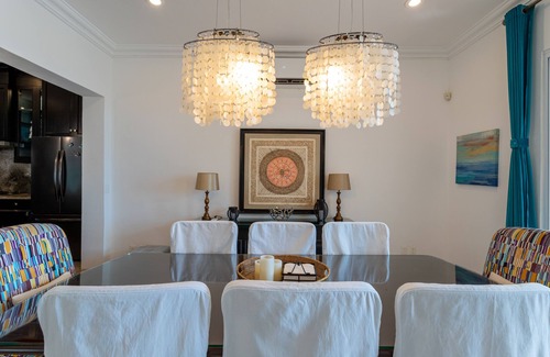 Villa Karina features over 4000 square feet of beautifully appointed space on two floors and large, furnished rooftop terrace. The main floor with its 10 foot ceilings offer an open concept design. The foyer, kitchen, dining room, and living room are all facing the exquisite pool overlooking the turquoise sea. Huge sliding glass doors allows for unobstructed views of the private pool area and ocean.