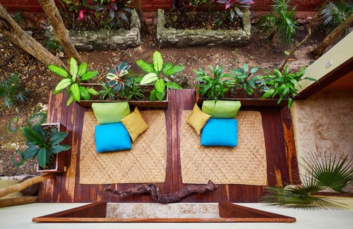 Modem Room it has a modern touch with a beautiful design and a mix of elements like exotic Woods, green onyx and a spectacular bambu ceiling, the room is about 50m2 with a kingsize bed balcony overlooking the jungle walk-in closet with a mexican decor, a large bathroom with a jungle view.